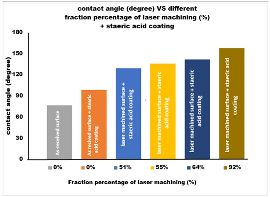 The laser machining of the aluminum alloy surface using the picosecond laser beam followed by the ethanolic stearic acid coating showed an increase in the contact angle by at least 30° as compared to the non-machined, coated surface. The contact angle after engraving different pattern designs on the aluminum alloy showed a variation in wettability on the surface. The patterns were line and grid with 200 μm and 70 μm pitch distances engraved on the surface. The fraction of laser-machined areas on the surface varied based on the designed pattern and the angle of the laser incident beam. As the pitch spacing narrowed, the ratio of the laser-machined area to the non-machined areas increased. The influence of different laser machining ratios on the water droplet contact angle is presented in Figure 2. This increase in the fraction of the laser machining area corresponded with a gradual increase in the contact angle—approaching a maximum contact angle of 142° within 50%–65% of laser-machined areas. The non-wetting state reached the superhydrophobic state at 92% with a contact angle >155° measured at the surface.