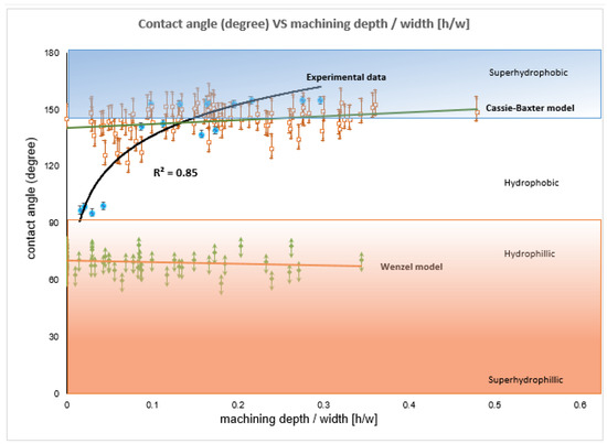 Varying the topography of non-machined areas—by creating machining depths and paths using the laser beam—influences the surface wettability. Figure 3 illustrates the relationship between the wettability degree of the surface to the ratio of the laser-machined depth to the non-machined width. The experimental data show a transition in the wettability of the metal surface from the simulated Wenzel model at the smooth surface to the Cassie–Baxter model at a geometrical surface. This transition in the wettability condition materialized at a ratio greater than 0.135 between the designed laser-machined depth to the width of non-machined areas. The 85% value of when representing the data, emphasizes the influence of increasing the ratio of a geometrical factor in the microtexture on the gradual increase in the contact angle on the textured surface. The simulated Wenzel model refers to the wettability condition of the laser-textured aluminum alloy surface with the consideration of a nontreated surface having an inherent hydrophilic nature. In Figure 3, the increase in surface hydrophilicity is a result of the increase in roughness of the intrinsic hydrophilic alloy surface. Hydrophilicity improves the surface stimulus by increasing the roughness ratio of the laser-textured surface. Correspondingly, the Cassie–Baxter model refers to improved surface hydrophobicity at lower surface energies as the surface roughness passes a threshold range. The simulated curve of the Cassie–Baxter model in Figure 3 shows an increase in the contact angle as the ratio of the designed laser-machined depth to the non-machined area increased on the coated surface. As a result, a water droplet preserves its surface energy by making a semi-spherical shape on the textured surface.