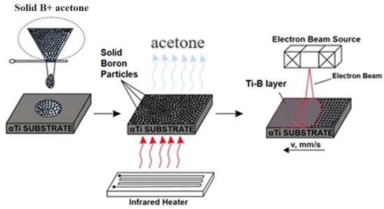 Following the evaluation of the scientific literature, the application of titanium boride coatings leads to a great improvement in the mechanical characteristics of different substrates. A number of investigations consider the application of TiB compound in the form of reinforcement particles aiming to improve the functional properties of titanium-based materials [,]. Also, the formation of titanium borides in the form of thin films and coatings for protective purposes by magnetron sputtering technologies was also extensively investigated [,,]. However, the fabrication of Ti–B hard composite surface structures and coatings on Ti substrate by an electron beam surface alloying technology is currently not yet studied. For this reason, the present paper aims to study the possibilities of the fabrication of composite coatings in the system of Ti–B with a significantly increased hardness and improved coefficient of friction compared to the titanium substrate achieved via the EBSA technology.