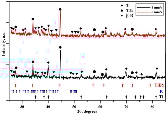 The XRD patterns of the fabricated surface alloys in the Ti–B system are shown in Figure 2. Both diffractograms, corresponding to specimen movement speeds of 4 and 6 mm/s, respectively, are typical for polycrystalline materials. Diffraction maxima of pure α–Ti, pure B, as well as TiB2 are present in both cases. The ICDD (International Center for Diffraction Data) database was used for the evaluation of the phase composition of the fabricated coatings, ICDD PDF# 44 1294 for α–Ti, ICDD PDF# 31 0207 for B, and ICDD PDF# 35 0741 for TiB2. Also, the reference peak positions, according to the ICDD database of the aforementioned phases, are shown in Figure 2. The results show good agreement between the positions of the experimentally obtained diffraction maxima and those available in the crystallographic database. Concerning the pure B phase, some peaks do not appear in the experimentally obtained diffraction patterns which, however, are characterized by very low intensities in the crystallographic database. This, together with the small amount of the boron content could be considered as the reason that some diffraction maxima of the B phase disappear from the experimentally obtained diffractograms. Nevertheless, according to the ICDD database, the main boron peaks located between 33 and 39° at a 2θ scale are well visible, meaning that some amount of undissolved boron exists in both considered cases. The intensities of the TiB2 peaks are the highest. This means that the titanium diboride phase is the main one detected on the surfaces of the samples. It should be noted that no amorphous-like halos can be observed at the lower Bragg angles, meaning that the obtained surface alloys and coatings are fully crystalline. Additionally, the phase composition remains unchanged, which is proof that the movement speed of the specimens does not affect the phase formation during the process of EBSA within the presented technological conditions. It should be noted that the ratios between the intensities of the peaks of the TiB2 phase are in good agreement with the ICDD database. Moreover, no changes in the intensities of the diffraction peaks were observed as a function of the movement speed of the specimens. This means that changing this technological parameter does not lead to a change in the texturing and formation of a preferred crystallographic orientation of the samples. Such texture changes and the formation of preferred crystallographic orientation significantly influence the resultant functional properties of the formed surface alloys and coatings []. At the same time, no significant changes in the peak positions of the aforementioned phase are observable. The observed shift between the peaks of the coatings formed by the speed of the movement of the workpiece of 4 and 6 mm/s, respectively, is less than 0.01° at a 2θ scale, meaning that the lattice parameters and unit-cell volumes remain unchanged or their deviation from each other is insignificant. This again could be considered very important for the resultant functional properties of the fabricated Ti–B surface alloys and coatings [,].