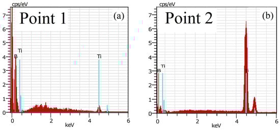 Figure 3 presents a cross-sectional SEM micrograph of the specimen alloyed by the lower movement speed (i.e., 4 mm/s). The alloyed zone is marked as A, while the Ti substrate is indicated as B. The chemical composition of the specimen is studied by energy-dispersive X-ray spectroscopy (EDX) experiments. The points where the chemical composition was investigated are marked as 1 and 2. The experimentally obtained EDX spectra are presented in Figure 4 and the results are summarized in Table 1. Figure 4a corresponds to Point 1 marked in Figure 3 while Figure 4b is associated with Point 2. The measured average thickness of the alloyed zone (i.e., Zone A from Figure 3) is about 50 μm. The results obtained show that the applied technological conditions, particularly the selected movement speed of the sample of 4 mm/s, led to the formation of a clearly separated alloyed zone and base titanium substrate. Considering the structure of the obtained surface alloy, it is obvious that two regions can be distinguished—darker and brighter. The chemical composition of both zones was investigated where the darker region corresponds to Point 1 while the brighter one is to Point 2. The results revealed that Point 1 consists of undissolved boron meaning that it has not been completely dissolved into the Ti matrix. However, considering the brighter zone, the amount of Ti is 36.4 at% and the concentration of B is 63.6 at%. The binary Ti–B phase diagram shows that the analyzed brighter zone fully corresponds to the TiB2 compound []. Also, it should be noted that some defects, like pores, cracks, etc., exist (marked with black arrows in Figure 3). They could be attributed to the existence of two different compounds (TiB2 and pure boron) with different thermo-physical properties. The presence of two different elements within the alloyed zone could be considered as a prerequisite for the formation of such defects which can be formed during the process of miscibility between them. The results obtained by the SEM and EDX experiments are in agreement with those of XRD measurements confirming that the phase composition of the formed surface alloy in the system of Ti–B is in the form of a TiB2 structure with some amount of undissolved boron. It is clearly visible that the undissolved boron element is not only on the surface but also within the depth of the formed surface alloy, meaning that the undissolved boron element penetrated during the alloying procedure but did not dissolve into the Ti matrix.