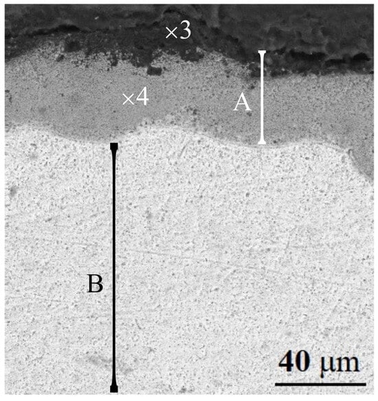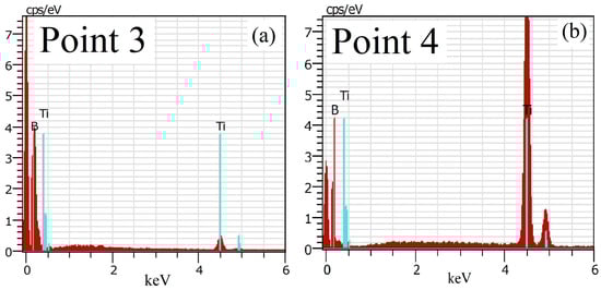 Figure 5 presents a cross-sectional SEM micrograph of the sample processed by the higher movement speed (i.e., 6 mm/s). The alloyed region is marked as Zone A, while the Ti plate is indicated as B. The average thickness of the alloyed zone formed with a movement speed of 6 mm/s is about 40 μm, which is slightly less compared to the alloyed zone produced with a movement speed of 4 mm/s. According to [], the speed of the samples during the electron-beam processing of the materials has an impact on the temperature of the surface, heat input, and depth of the alloyed zone. It was shown that the temperature on the surface increases with the decrease in the movement speed of the sample in all cases. This correlates with the results achieved in this study where the lower movement speed of 4 mm/s led to the formation of a thicker alloyed zone as compared to that obtained with the higher movement speed of 6 mm/s. The EDX results of the chemical composition of the fabricated coatings are shown in Figure 6 and summarized in Table 1. Figure 6a corresponds to Point 3 while Figure 6b corresponds to Point 4 marked on the cross-sectional image presented in Figure 5. The results show that the darker regions (Point 3 from Figure 5) of the alloyed zone fully correspond to undissolved boron. The chemical composition of the brighter zone (i.e., Point 4 indicated in Figure 5) consists of Ti and B, indicating that a composite phase in the system of Ti–B has been successfully formed. It was found that the amount of boron is 67 at% while the titanium amount is 33 at%, corresponding to an ideal 2:1 ratio. The binary Ti–B phase diagram shows that the considered zone fully corresponds to the TiB2 compound []. When comparing the two alloyed zones, no noticeable difference between their phase compositions can be established, apart from a slightly higher concentration of pure undissolved boron in the structure of the specimen treated with the higher movement speed. This is undoubtedly caused by the reduced input temperature per unit of time. This temperature was apparently not enough to completely melt the solid boron particles atop the surface of the substrate. However, under the undissolved B particles, the top of the titanium substrate was melted, and some amount of the boron particles were introduced into the molten material, leading to the formation of the TiB2 compound under the undissolved boron. Also, no or a very small number of structural imperfections, such as pores and cracks, can be observed, which could be attributed to the fact that the undissolved boron remains on the top of the surface alloy, not within the whole alloyed zone.
