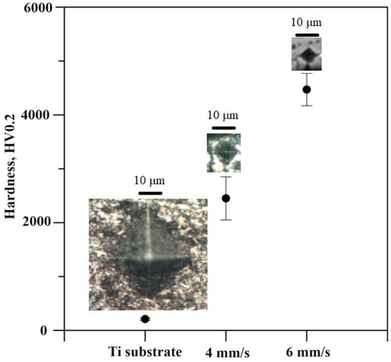 - The hardness of the surface alloy fabricated via the higher speed of movement of 6 mm/s significantly exceeds that of the base titanium substrate. The measured values of the obtained coatings using the speed of movement of the specimen reached about 4500 HV. The values of microhardness of the surface alloy fabricated via the lower speed of motion of 4 mm/s are about 2600 HV.