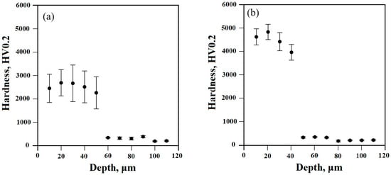 Figure 8 presents the distribution of the microhardness from the surface to the depth of the samples (i.e., fabricated by the speed movement of 4 and 6 mm/s). Figure 8a presents the results of the coating obtained by 4 mm/s while Figure 8b exhibits the results of the coating obtained by 6 mm/s. The hardness of the specimen fabricated by the lower speed movement of 4 mm/s is in the range of 2400–2700 HV at depths of up to 50 μm, followed by a decrease to values ranging from 300 to 370 HV at depths from 50 to 100 μm. The measured values at depths higher than 100 μm are about 200 HV. This is a typical value for the Ti substrate. The obtained values for the sample fabricated by the higher speed motion are in the range of 4100–4900 HV at depths of up to 40 μm. With an increase in the depth of the specimen, the hardness decreases significantly as it is in the range from 300 to 360 HV within the distances from 40 to 70 μm from the surface to the bulk. At higher depths, the hardness drops further to about 210 HV. These results are fully consistent with those for the microstructure and thickness of the obtained coatings in the system of Ti–B where the measured hardness remains relatively unchanged within the whole coating in both cases. After that, it decreases significantly but is still a bit higher than the titanium material because in both cases a heat-affected zone with improved mechanical properties exists. The existence of such a region is typical for electron-beam-processed materials []. Below this heat-affected zone, the measured microhardness decreases to values that are typical for the titanium substrate.