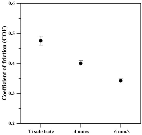 - The coefficient of friction (COF) for the specimen alloyed by a speed of motion of 4 mm/s is 0.40; the value for the coating obtained by a speed of motion of 6 mm/s is 0.34. In both cases, these values are lower than that of the titanium substrate.