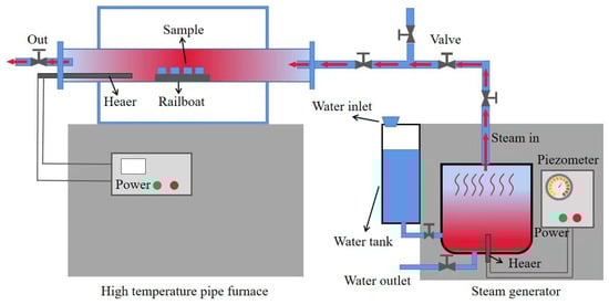 The water vapor corrosion experiment can simulate the accident fault tolerance test of the coating in high-temperature water vapor environments. The experiment was conducted on a custom-built laboratory platform, shown in Figure 1. In Figure 1, the right-side device is the water vapor generator. The left device is a high-temperature tube furnace with a set temperature of 700 °C. After the temperature reached the set temperature, the water vapor generator was applied with an outlet pressure of 0.3 MPa. The samples were placed into it for 10, 50, 140, 200 h. Deionized water was added into the tank every 10 h to maintain the outlet pressure of the steam generator.