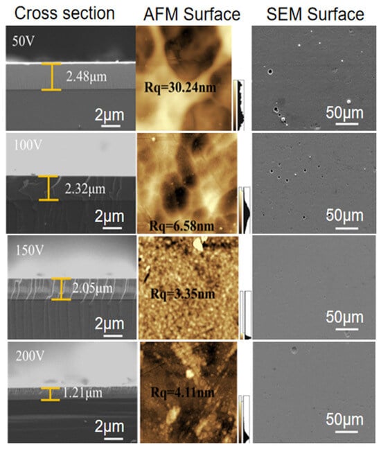 According to the AFM results, as shown in Figure 2, root-mean-square roughness Rq gradually decreases from 31 ± 5 nm to 6 ± 1 nm while the bias increases from 50 V to 100 V. The reason why the surface roughness of the coating is greatly affected is that in the initial stage of coating deposition, the coating will reproduce the uneven surface morphology of the substrate after ion etching. At low bias, it is more difficult to obtain atomic supplement in the depressed area than in the prominent area due to the geometric shielding effect, so the difference between the two parts gradually increases with the deposition process. The surface roughness of the coating is greater. Correspondingly, under high bias, the bombardment of high-energy particles will erode the protruding parts of the coating surface and weaken the geometric shielding effect. In addition, the increase in bias also leads to the enhancement of the resputtering effect, and the atomic supplement rate of the depressed part and the protruding part becomes close, so the coating shows a lower surface roughness. When the bias is higher than 150 V, the bias exhibits slight influence on the surface roughness. As shown in the surface SEM images of the coatings, fewer holes and particles can be observed at higher bias.