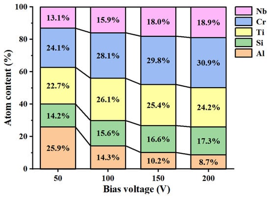 The element content change of the coating measured using EDS is shown in Figure 5. With a bias of 50 V, the Al content is the highest of about 26 at.%. The amount of Al decreases significantly as the bias increases. Due to its light mass, the Al is susceptible to a back-sputtering phenomenon, resulting in less Al ions reaching the substrate or Al ions being bombarded out from the deposited coatings []. When the bias increases from 50 V to 100 V, the content of Al decreases from about 26 at.% to about 14 at.%. Samples with a bias of 100 V, 150 V, and 200 V have the highest content of Cr of about 28 at.%, 30 at.%, and 31 at.%, respectively.