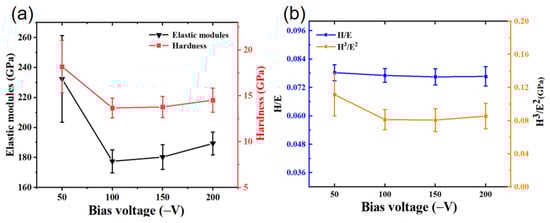 The hardness and elastic modulus of the coatings are shown in Figure 7a. The hardness and elastic modulus have the same change trend that they gradually decrease as the bias increases. At 50 V, highest hardness and elastic modulus are achieved at 18 ± 3 GPa and 240 ± 15 GPa, respectively. In Figure 7b, H/E and H3/E2 are shown, which are generally used to evaluate the fracture toughness of hard coatings, especially in ceramic materials []. H/E and H3/E2 of the coatings have similar variation trends with hardness and elastic modulus. When the bias is 50 V, the coating has the highest H/E and H3/E2, which are 0.08 and 0.11 GPa, respectively. When the bias is 200 V, H/E and H3/E2 drop to 0.075 and 0.085 GPa, respectively.