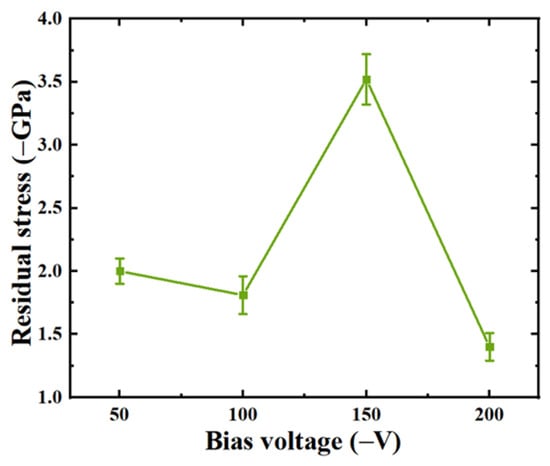 The residual stress of the coatings is shown in Figure 8. All the coatings showed residual compressive stress. At 150 V, the highest residual compressive stress is 3.5 GPa, while the lowest residual stress is 1.4 GPa at 200 V. The residual stress of the coatings results from the bombardment effect of high-energy ions. Under negative bias, the ions sputtered by the target material and the working gas ions close to the target material have an energy between 10 eV and 100 eV when moving to the substrate. The high-energy ions produce an ion peening effect on the substrate, producing defects and also causing the increase in residual pressure stress. However, at the same time, the mobility of the surface-adsorbed atoms rises due to the collision of high-energy ions to the surface of the substrate, which also promotes the fusion of defects and reduces the residual stress []. The final residual stress is determined by the competition of these two above factors.