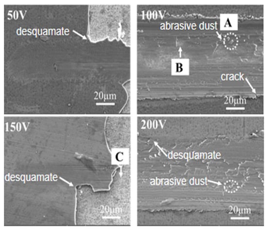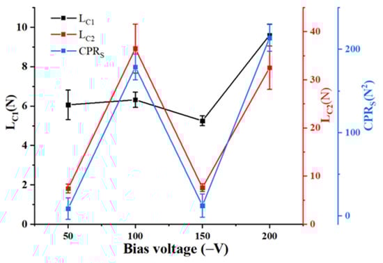 Scratch toughness results of the coatings are shown in Figure 9. In the scratch experiment, scratches are generally divided into three stages. The first stage is the initial cracking stage, the second stage is the initial peeling stage, and the third stage is the complete peeling stage. These three phases correspond to the three critical loads, Lc1, Lc2, and Lc3. However, if the coating binding force to the substrate is strong, the third stage may not occur. The scratch toughness of the coating is generally characterized by the crack extension resistance value (CPRs), which reflects the binding force between the coating and the substrate, as well as the toughness of the coating [].