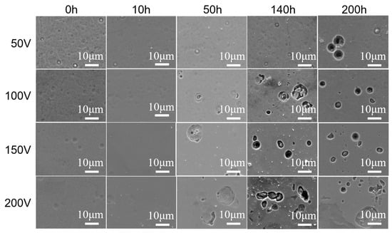In the water vapor corrosion test, the temperature was set to 700 °C. Changes in the samples were monitored at different time periods of 10, 50, 100, 140, and 200 h. The surface morphology images of the corroded coatings are shown in Figure 11. The sample with a bias voltage of 50 V has corrosion pits after 140 h and 200 h, while samples of other bias voltages have corrosion pits after 50 h and 140 h. Two types of corrosion pits can be observed in the morphology images, as shown in Figure 12. One is the regular round corrosion pit, which mainly develops from the particle defects in the process of coating preparation. The other is the shallow corrosion pit with irregular depth, mainly because of the uneven corrosion in the corrosion process. Elemental analysis is performed for different corrosion regions as well as areas without defects, as shown in Table 2. The content of O in the defect-free area (Zone 1) and the irregular shallow pit area (Zone 3) is basically consistent. An Fe element of 65.0 at.% and Mn element of 11.0 at.% can be detected in the regular circular pit area (Zone 2). In addition, traces of elements of the substrate have been found in this region, indicating corrosion to the substrate.