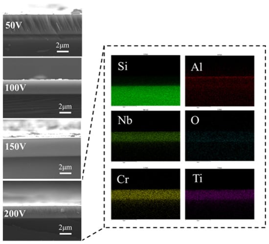 The cross sections of the coatings corroded for 200 h were studied, there were no penetrating holes in the cross sections, and the coating was combined well with the substrate. The EDS results of the sample with a bias of 200 V are shown in Figure 13. All elements except Al are still evenly distributed in the coating. The distribution of Al element in the cross-section shows that the content of Al element near the surface of the coating is high, which is caused by the gradual diffusion of Al element to the surface during the experiment. This phenomenon can be observed in the coating at various levels of bias.