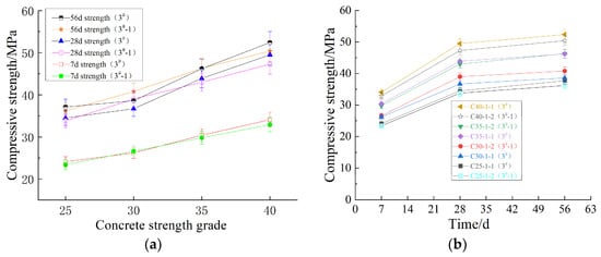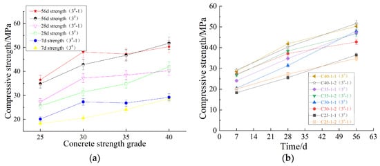 Compressive strength of ordinary concrete at different ages. (a) Compressive strength at concrete strength grade; (b) Compressive strength at different ages.