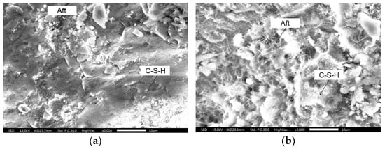 To investigate the failure mechanism of semi-immersed concrete specimens, a SEM analysis was performed on the immersion zone and the alternate wet–dry zone of the concrete specimens. The SEM images of the immersion zone and the alternate wet–dry zone are shown in Figure 7.