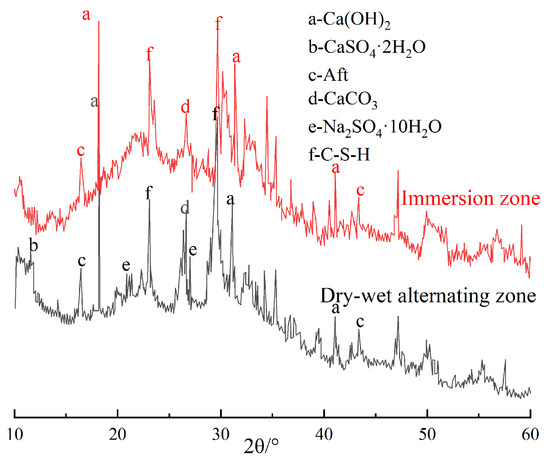 Based on the above observations, it is believed that the concrete products in the immersion zone consist of hardened cement paste C-S-H and ettringite. This indicates that chemical erosion primarily occurs in this area. In the alternate wet–dry zone, in addition to the hardened cement paste C-S-H and ettringite generated from chemical reactions, there is also gypsum and mirabilite (Na2SO4·10H2O) primarily formed through physical crystallization. This suggests that this area is the result of the combined action of chemical and physical erosion, with gypsum being the predominant form of damage.