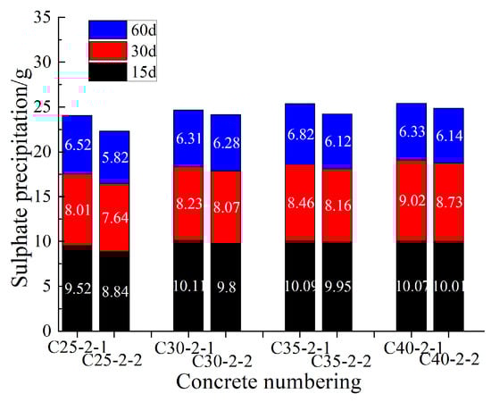 In the quest to unravel the intricacies of alkali–aggregate reactions in concrete, samples of reaction products were meticulously gathered from concrete structures in Shanxi Province, China. The analysis revealed that a staggering 90% of these reaction products manifested as Na2SO4 [1]. In order to study the mechanism of concrete alkali flooding, the following experiments were carried out: A strategic immersion of the concrete in a 5% Na2SO4 solution was executed for a designated span. After extraction from the solution, the specimen’s mass was meticulously measured, followed by a thorough drying process and another round of weighing. The discernible disparity in mass pre- and post-drying treatments shed light on the concrete’s propensity to absorb the Na2SO4 solution. A substantial shift in mass signified an abundance of internal pores, hence heightened permeability. Conversely, a minimal shift indicated a scarcity of internal pores, translating to lower permeability. The methodology for gauging alkali–aggregate reaction products is expounded upon in Section 2.2.3.