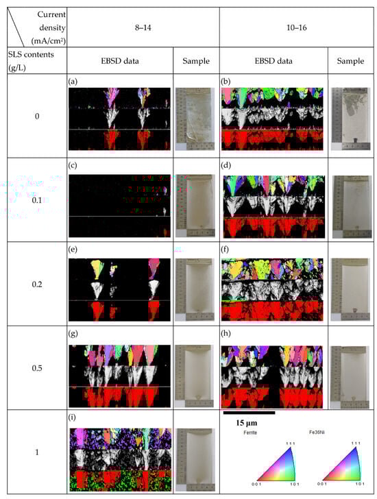 Among the electroplating process conditions, Fe2SO4∙7H2O and NiSO4 were set as invariant using a 10 μm thick Invar thin film fabricated using the electroplating method, and the microstructural evolution of the specimens as a function of SLS contents was analyzed using EBSD analysis, as shown in Figure 1. The phase colors were coded by Fe-36Ni as red and α-ferrite as green in the phase maps.