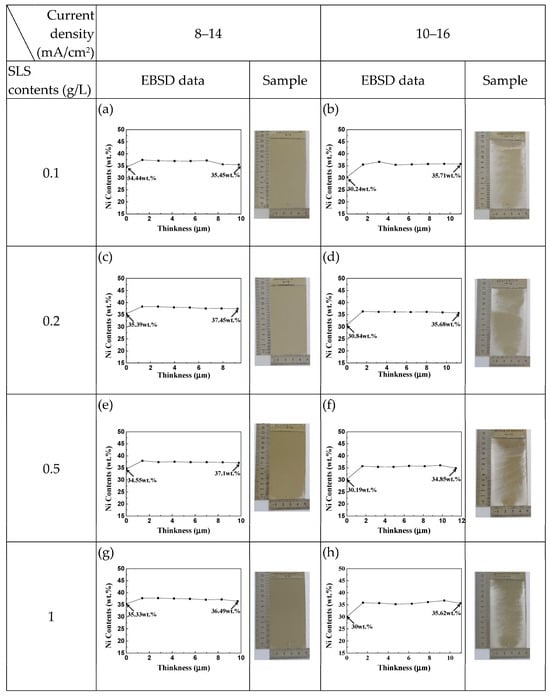 Figure 2 shows the concentration profiles along the thickness direction for different SLS contents at pH 2.8. The composition of the electrodeposited samples consisted of Ni contents at or below 30 wt.%, and as the amount of SLS content increases, the electrodeposition composition decreases, indicating a relation to the broadening of the white storage strain phenomenon. The large difference in elemental composition on the electrodeposited surface is attributable to the columnar structure that appears during the electroplating process. The columnar structure refers to pillar-shaped grains that form during the electroplating process, and their growth during the electrodeposition process was confirmed by EBSD analysis. Additionally, it can be assumed that the electrodeposition composition was low, owing to the growth of the columnar structures. As shown in Figure 2c,e,g, unlike the other samples, a uniform elemental composition was measured at the center of the samples. In particular, in Figure 1c, the thickness compositional gradient of all areas, except the electrodeposition composition, was measured uniformly. For current densities ranging from 8 to 14 mA/cm2, the thickness compositional graph exhibits less uniformity compared to the current density range of 10–16 mA/cm2, which is attributable to the wider white rust region. The wider the white rust region, the less uniform the composition by thickness is, as shown in Figure 2i.
