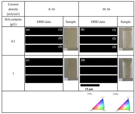 EBSD analysis was performed, comparing Figure 1c,e,g to thoroughly examine the white rust process. The phenomenon becomes notably more significant as the amount of SLS content increases. The effect of SLS content as a surfactant facilitates relaxation of the interface between the plating solution and the cathode and reduces the difference in surface tension at the solid–liquid interface, allowing the liquid to easily penetrate into the solid [].