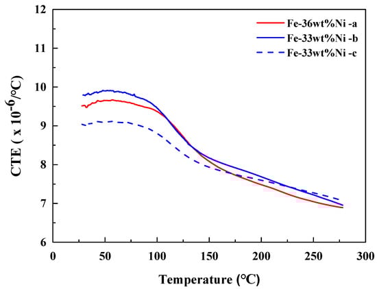 The relative change in specimen length (ΔL/L0) was measured as a function of temperature (T) and the CTEs of the electrodeposited samples is shown in Figure 5. The CTE, α, was obtained by differentiation of ΔL/L0 with respect to temperature: