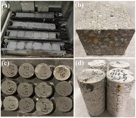 Various specimens for different measurements. (a) Bond strength test samples, (b) freeze-thaw samples, (c) chloride ion diffusion specimen, and (d) axial compressive strength test samples.
