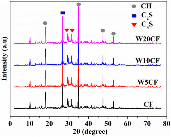 Figure 4 presents the X-ray diffraction (XRD) patterns of the concrete modified with WBE at different doses after a 28-day curing period. The results revealed that all materials exhibited diffraction peaks of calcium hydroxide (CH) at 18.2°, 34.1°, 47.3°, and 50.3°, tricalcium silicate (C3S) at 29.2° and 32.1°, and dicalcium silicate (C2S) at 27.9° [21]. No new diffraction peaks were detected in the WBE-modified concrete, indicating that the addition of epoxy resin did not generate new hydration products or affect the crystalline composition of the hydration products. Furthermore, the intensity of the C3S and C2S diffraction peaks decreased with an increasing WBE dosage, while the intensity of the CH diffraction peak raised. This suggested that the incorporation of WBE facilitated the hydration reaction, promoted the consumption of C3S and C2S derived from the cement raw materials, and accelerated the formation of CH and other hydration products. The combination of hydration products promoted a more adequate hydration reaction [22], thus in favor of an advancement of the mechanical performance of the concrete.