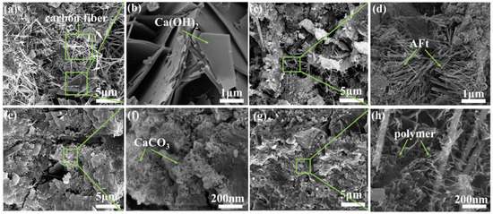 Figure 5 depicts the SEM micrographs of the WBE-modified concrete. In Figure 5a,b, in the absence of WBE, concrete exhibited a loose morphology, displaying discernible gaps and cracks. The presence of cement hydration products, namely calcium-silicate-hydrate (C-S-H), are visible in the pattern of rod-like and needle-like crystals (ettringite AFt phase). The abundant functional groups (hydroxyl, etc.) on the surface of the epoxy resin provide sufficient points for crystal growth. The adsorbed Ca2+ lowered the concentration of Ca2+ in the solution and promoted the ionization process of the cement, resulting in the production of an excess of Ca2+ and OH− in the solution. This effect promoted the formation of well-crystallized Ca(OH)2 crystals, which are optimally oriented to grow along the crystal surface. The Ca(OH)2 crystals are manifested in enlargement and thickening. The inadequate hydration of the cement led to insufficient pore filling via hydration products. Conversely, the images in Figure 5c–h show a highlighted increase in WBE doping, which significantly improved the structural denseness and reduced the number of cracks and pores. In Figure 5e, the concrete admixed with 10% epoxy resin (W10CF) exhibited the densest structure, the fewest cracks, a uniformly sized hydration product, and close packing of the hydration products around the aggregates. This could be attributed to the abundant functional groups on the chain segment of the WBE resin, which provided sufficient growth points for crystals. The hydration reaction was conducted more thoroughly and accelerated the production of calcium hydroxide. Similarly, a small number of crystal clusters of CaCO3 can be observed in Figure 5f, mainly due to higher CO2 concentrations or short-term carbonation. With further hydration of the cement, the polymer particles within the capillaries gradually agglomerated and flocculated together, forming a close layer on the surface of the cement gel [23,24]. In particular, the water between the polymer particles was absorbed to participate in the cement hydration, leading to the complete condensation and closure of the polymer particles on the mixture surface to form a continuous polymer reticular film. Figure 6 explains the chemical reaction between the polymer and cement hydration products, and the formation of a three-dimensional network structure. However, the SEM images in Figure 5g,h illustrated that when WBE doping up to 20% (W20CF), cracks were apparent, as was deterioration of the density. This could be attributed to the excessive epoxy resin encapsulation of aggregates hindering the hydration reaction. In Figure 5h, the polymer epoxy resin film presents network-like micelles, which are wrapped around each other after polymerization, with only a small amount of cement particles, hydration products, and carbon nanofibers embedded into them.