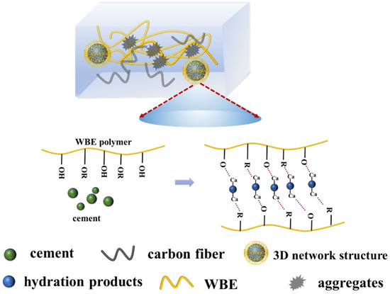 The chemical reaction of WBE with cement hydration products, and the formation of three-dimensional network structure.