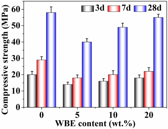 Compressive strength of WBE-modified concrete with various WBE contents.