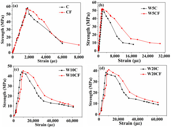 Figure 8 presents the impact of different proportions of polymer WBE admixtures (0%, 5%, 10%, and 20%) and fiber fractions on the compressive strength of WBE-modified concrete. The stress–strain curves for each concrete specimen are depicted in Figure 8. The elastic modulus of the modified concrete gradually declined while the ductility and crack-arresting capacity were enhanced with the addition of WBE. Moreover, the compressive strength and elastic modulus of the modified concrete showed a downtrend with an increase in WBE. This behavior can primarily be attributed to the lower compressive strength and elastic modulus of WBE compared to the cement concrete matrix, leading to the greater susceptibility of WBE-modified concrete to deformation during compression. For concrete without WBE (Figure 8a), instability was more likely to occur in the yielding stage, with cracks spreading rapidly through the matrix after reaching the ultimate compressive strength. Consequently, the force curve reduced rapidly, and the strength declined prominently to below 20%. However, the addition of the fiber does not effectively alleviate this phenomenon. In contrast, the decreasing section of the stress–strain curve was progressively smoothed coupled with the addition of WBE, and the toughening effect of the fiber components was more pronounced. These observations suggested that water-based epoxy (WBE) was a primary reason for the ductility enhancement of the concrete. Moreover, the crack resistance and toughening effect of the fiber component were more evident when it was used with WBE [26,27,28]. WBE improves the fiber dispersion and enhanced fiber pull-out effect via the encapsulating process. The cutting effect of the cement particles is alleviated as well.