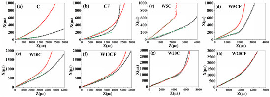 Figure 9 illustrates the 28-day compressive Poisson’s ratio curves of concrete specimens. The longitudinal and transverse strains of the specimens are shown on the horizontal and vertical coordinates, respectively. Each curve represents the upper and lower Poisson’s limits of the measured concrete specimens. The solid green line indicates the fitted line of the elastic deformation process of the specimens, and its slope is calculated as Poisson’s ratio. In Figure 9a, the transition of the compressive damage and matrix cracking of the unmodified plain concrete are staged, coupled with cracks occurring and expanding rapidly. With the addition of WBE, the deformation process of concrete was more stabilized (the upper and lower limits were closer) and the transition from the elastic phase to the yield phase was smoother (the curve deformation was smaller). This revealed that the crack extension was accompanied by a crack-blocking effect, which delayed the occurrence and further extension of cracks. Meanwhile, the high ductility and strong strain of the fiber reduced the occurrence of sudden collapse and loading force loss for the concrete matrix in the process of compressive deterioration. Overall, the WBE and carbon fiber provided improved confinement of the concrete matrix, and effective crack control [29].