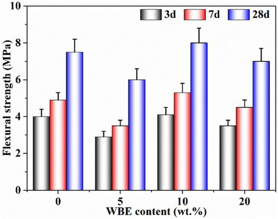 Figure 11 depicts the flexural strength of WBE-modified concrete with curing times of 3, 7, and 28 days. As illustrated in Figure 8, the flexural strengths of concrete with 0%, 5%, 10%, and 20% (mass fraction) WBE after 28 days were 7.5 MPa, 6.1 MPa, 8.1 MPa, and 7.2 MPa, respectively. The flexural strength of concrete exhibited an upward and then downward trend with an increasing amount of WBE. The maximum flexural strength was observed at 10% WBE. The observed enhancement can be attributed to the presence of abundant hydroxyl and oxy functional groups on the surface of the WBE, which exhibited excellent compatibility and contributed to the improvement of compressive and flexural strength of the concrete [31]. However, excessive WBE retarded the hydration reaction of the concrete by reducing the water content. In the meantime, a polymer film covering the surface of the aggregate and hydration products limits further hydration. Because the strength and elastic modulus of the polymerization film were relatively lower than that of the pure slurry, resulting in cracks or defects in the concrete matrix with exposure to stress, this ultimately negatively impacted its mechanical properties [32].