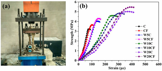 Cylindrical specimens of Φ100 mm × 200 mm was used for concrete. The testing was displacement-controlled with a loading rate of 0.05 mm/min. There were 3 specimens evaluated in each group and averaged, and the results were accurate to 0.01 MPa. The strain gauges were examined to collect the strain values in the elastic deformation stage of the samples, and the displacement gauges were examined to collect the strain values in the yielding and breaking deformation stages of the samples. The stress–strain curve, modulus of elasticity, and Poisson’s ratio of the concrete were calculated after the determination. The calculation method was as follows: