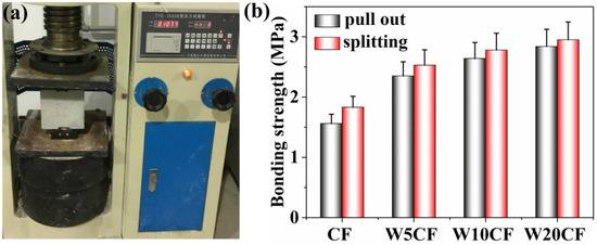 (a) The interface bond strength test loading equipment, (b) The interface bond strength of various WBE-modified concrete samples with curing age of 28 days.
