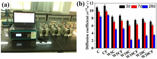 (a) Chloride ion flux test instrument, (b) chloride ion diffusion coefficient results of WBE-modified concrete of various curing ages.