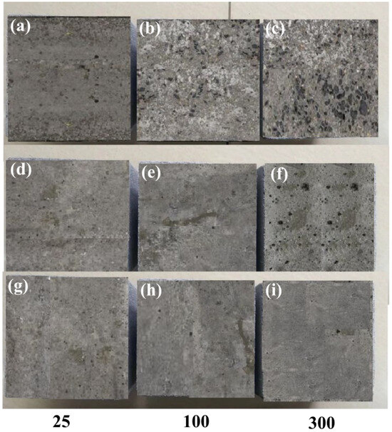 Photos of WBE-modified concrete specimen after 25, 100, 300 freeze–thaw cycles, (a–c) CF, (d–f) W5CF, (g–i) W10CF.