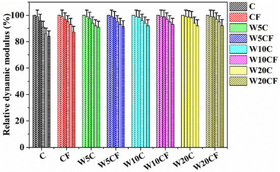 Figure 17 depicts the variation in the relative kinematic modulus of concrete modified with WBE under varying numbers of freeze–thaw cycles. The results displayed a continuous decrease in the relative dynamic elastic modulus with an increase in the freeze–thaw cycles. The fastest rate of decline was observed when without the WBE admixture. The relative dynamic elasticity modulus of CF, W5CF, W10CF and W20CF was 82.14%, 90.07%, 94.86%, and 92.04% after 300 freeze–thaw cycles, respectively, demonstrating the most significant loss of relative dynamic elastic modulus in the absence of WBE. Notably, W10CF exhibited the maximum relative dynamic elastic modulus of 94.86%, which was 7.51% higher than that of CF. The value increment could be attributed to two main factors. Firstly, WBE enhanced the microstructure of the concrete by reducing the number of cracks and gaps, thereby increasing its density. Secondly, the addition of WBE expedited the hydration reaction, leading to the formation of hydration products such as CH, which filled the capillary pores of the concrete, lowered the amount of free water, and consequently raised the dynamic modulus of elasticity [46].
