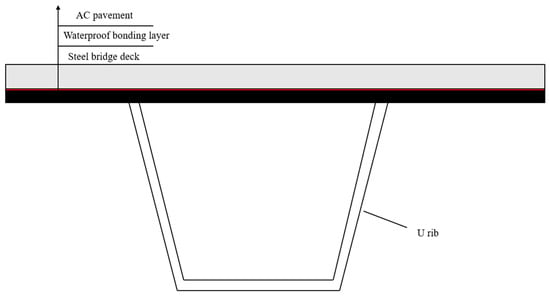 The structural configuration of a steel bridge deck pavement represents a classic stratified composition, typically consisting of a pavement layer, waterproof bonding layer, and steel bridge deck (as illustrated in Figure 1) [6]. Extensive research has been dedicated to investigating interlayer bonding within steel bridge deck pavements. This research has revealed that due to material performance disparities and construction process deficiencies, inadequate interlayer bonding is a common issue, resulting in a diminished load-carrying capacity between layers [7,8,9,10,11]. Unlike road pavements, bridge deck pavements experience distinctive stress conditions, environmental factors, and usage circumstances, making them more susceptible to a variety of distresses. The performance of the pavement directly affects the durability, safety, and driving comfort of bridges [12].