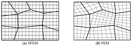 XFEM is built upon the concept of unit decomposition [29,30,31], enhanced by the introduction of enrichment functions that facilitate a specific representation of discontinuous displacements. This innovation allows for the independent existence of cracks and meshes, as depicted in Figure 2.