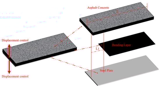 The thickness of the steel plate in our experiment was designed to be 0.014 m, with an elastic modulus of 210,000 MPa. Consequently, the asphalt layer’s thickness was computed as 0.066 m. A crack with a length of 0.2 m (where L1 represents the crack length) was prefabricated at the midpoint of the left end of the specimen, as illustrated in Figure 4. The specimen dimensions (where L represents the length of the specimen) are presented in Table 1.