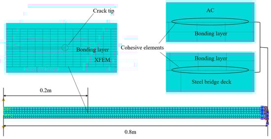 The finite element model of a double cantilever beam (DCB) comprises the AC layer, steel plate, and adhesive layer. The AC layer, steel plate, and adhesive layer in this study were modeled using plane strain elements (CPE4), with the adhesive layer’s interior specified as an XFEM region. Interface modeling for the steel bridge deck/adhesive layer and adhesive layer/asphalt pavement layer was accomplished using four-node two-dimensional cohesive elements (COH2D4). The adhesive layer was bias-refined along the longitudinal direction, focusing on the crack propagation region. To accurately represent delamination, the maximum stiffness reduction ratio was set to 0.99, meaning that elements were removed when the damage ratio reached 0.99. Cohesive elements tied the upper and lower layers to the adhesive layer. The choice of the viscosity coefficient affected the model convergence, computational time, and accuracy. This study employed a viscosity coefficient of 1 × 10−5, significantly improving the model convergence without substantial impacts on the strength and crack propagation predictions. The finite element model is illustrated in Figure 5.