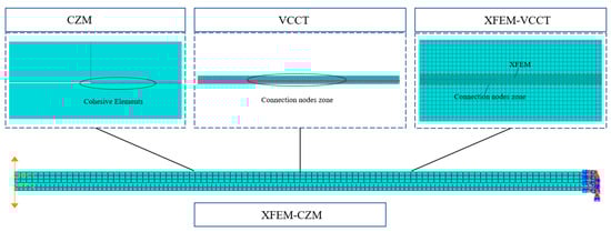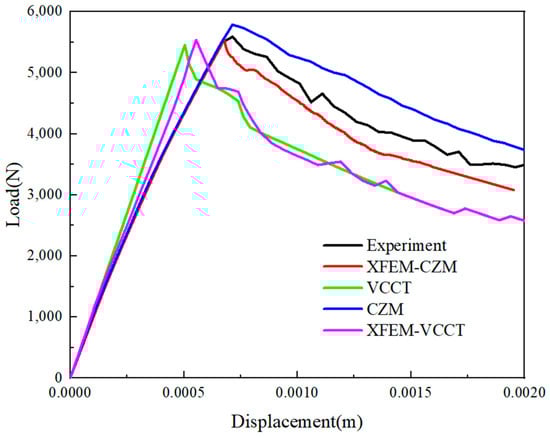 To validate the method employed in this study, four different Type I crack propagation models—VCCT, CZM, XFEM–CZM, and XFEM–VCCT—were established, as illustrated in Figure 7. A comparison was performed using the load–displacement curves obtained from the double cantilever beam (DCB) experiment. Figure 8 illustrates the load–displacement curves of the DCB under the influence of the different methods.