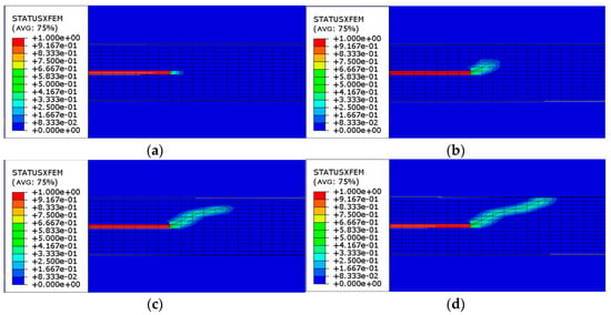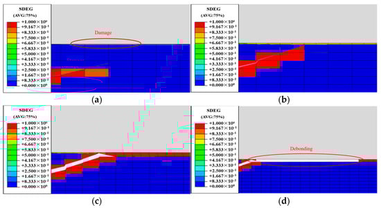 Initiation and propagation of cracks in the bonding layer: (a) crack initiation, U = 4.563 × 10−5 m; (b) crack propagation, U = 7.766 × 10−5 m; (c) crack propagation, U = 1.313 × 10−4 m; (d) crack reaches interface, U = 2.531 × 10−4 m.