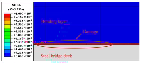 For this study, the damage variable of cohesive elements was set at 0.99, signifying that cohesive elements failed and were deleted when the damage reached 0.99. This approach vividly reflected the interface failure process. The interface layering in the steel bridge deck–asphalt layer bonding model is illustrated in Figure 10. SDEG represents the stiffness degradation ratio of the elements; these ranged between 0 and 1, where 0 indicated an intact state and 1 indicated complete damage without units. At a radial displacement of 1.313 × 10−4 m, damage began to appear at the interface; however, the crack had not reached the interface. Under the influence of the stress field at the crack tip, damage accumulated at the interface, increasing as the crack approached. At a radial displacement of 2.537 × 10−4 m, the crack reached the interface, causing further damage accumulation at the interface. However, debonding had not occurred, resulting in interface layering. Subsequently, at a radial displacement of 6.789 × 10−4 m, partial debonding between the bonding layer and the asphalt paving layer occurred, leading to interface layering. Evidently, similar damage also arose at the interface between the steel bridge panel and the bonding layer, as depicted in Figure 11. This aligned with real-world scenarios, wherein after debonding, the steel plate remains partially bonded to the adhesive material while partially remaining smooth.