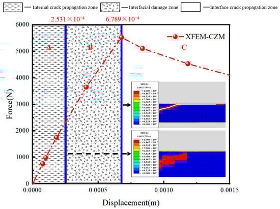 The entire failure process is visually apparent in Figure 12. Region A illustrates the extension of the crack towards the interface, while Region B depicts the accumulation of strain energy at the interface. Region C represents the point where the interface strength was reached and strain energy began to be released, triggering the expansion of interface cracks. For comparison, the cohesive zone model (CZM) method was also employed. The layering process simulated by the CZM method is illustrated in Figure 13, showing a highly similar failure process to XFEM–CZM. However, XFEM–CZM coupling provided a more intuitive representation of the complete process of the interface defect extension and the resultant layering.