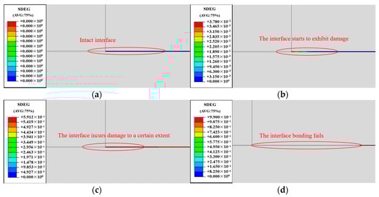 Interface layering process: (a) interface undamaged, U = 1.223 × 10−4 m; (b) interface damage occurs, U = 1.343 × 10−4 m; (c) interface damage occurs, U = 6.213 × 10−4 m; (d) interface debonding, U = 7.132 × 10−4 m.