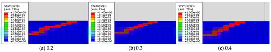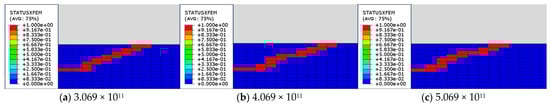 Under displacement-controlled conditions, the rightmost tip of the initial crack satisfied the maximum principal stress damage initiation criterion first. Subsequently, cracks extended through adjacent enriched elements, eventually penetrating the entire bonding layer, as depicted in Figure 9. STATUSXFEM in the figure represents the state of the expanding finite elements; these ranged between 0 and 1, where 1 signified complete damage and had no unit. When the radial displacement u reached 4.563 × 10−5 m, the stress value triggering the initiation of crack damage was reached. The crack started to extend towards the asphalt paving layer side and penetrated a single element. With a radial displacement of 2.531 × 10−4 m, the crack extended to the interface between the bonding layer and the asphalt paving layer. Subsequently, as displacement increased, strain energy accumulated at the interface, waiting for the interface strength to be reached before releasing the strain energy. This was followed by the propagation of cracks along the interface.