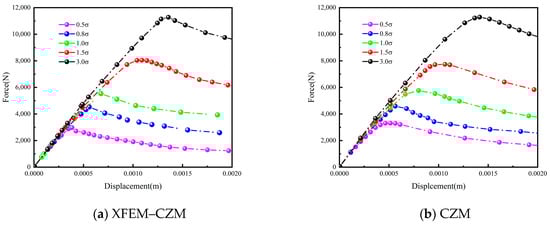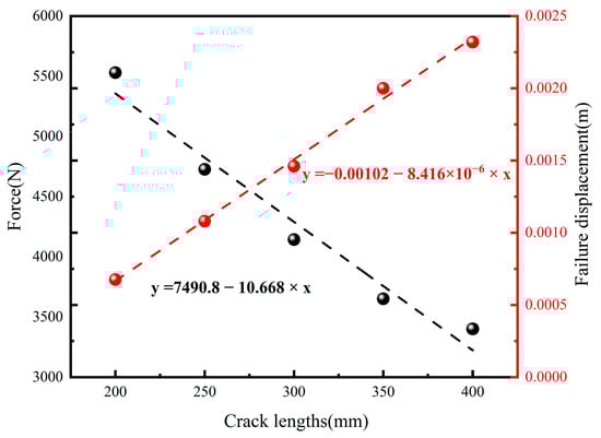 From Figure 15a, it is evident that the bonding strength between the steel bridge panel and asphalt paving layer decreased as the initial crack length increased. Conversely, the failure displacement rose with an increasing crack length. This behavior was attributed to the more pronounced stress concentration effect at the crack tip with longer initial crack lengths, resulting in reduced structural strength. The increase in failure displacement was due to the higher elastic strain energy stored within the longer cracks. Consequently, longer cracks required more significant displacement to release the stored energy, enabling crack propagation and eventual failure. Figure 15b presents the computed load–displacement curve using the CZM method, showing a close resemblance to the XFEM–CZM coupling approach in terms of the maximum load and failure displacement. Figure 16 displays the predicted curves of strength and failure displacement obtained through simulation.