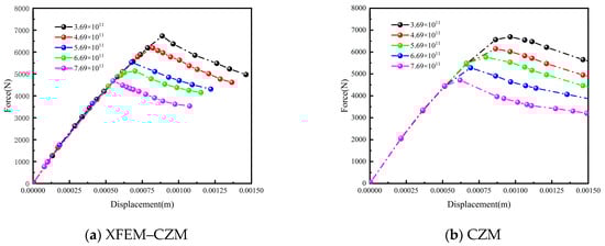 To explore the effects of different interface stiffness values on crack propagation and interface strength between a steel bridge deck and asphalt paving layers, simulations were conducted using interface stiffness values of 3.069 × 1011, 4.069 × 1011, 5.069 × 1011, 6.069 × 1011, and 7.069 × 1011 N/mm3. The results demonstrated that as interface stiffness increased, the crack propagation path within the bonding layer expanded, as depicted in Figure 17. Specifically, when the stiffness was 3.069 × 1011 N/mm3, the crack traversed 14 elements to reach the interface between the bonding and asphalt layers. However, for stiffness values of 5.069 × 1011 and 7.069 × 1011 N/mm3, the crack penetrated 15 elements and the penetration length increased. The load–displacement curves for a steel bridge deck and asphalt paving layer with varying stiffness values are shown in Figure 18a. Figure 18b provides a comparison with the results obtained through the cohesive method.